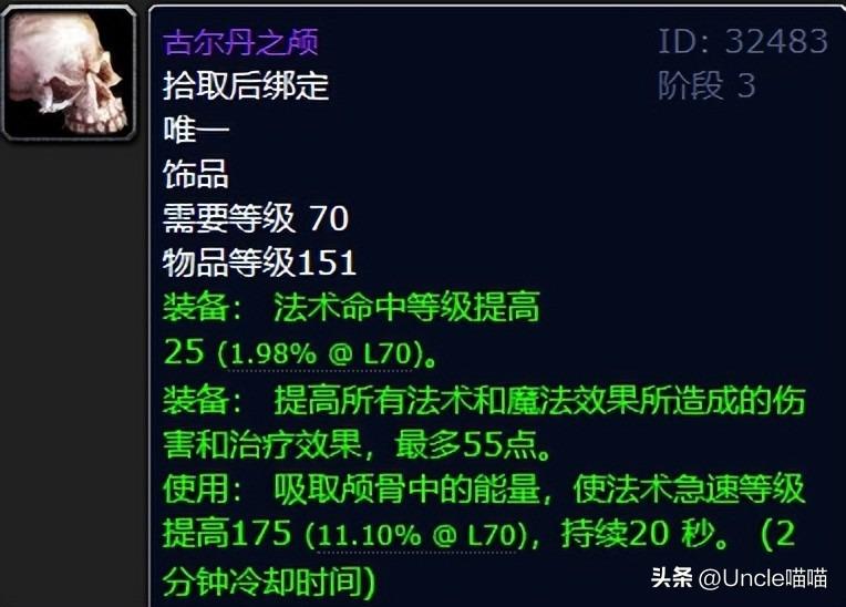 常驻法术命中 + 17、法术伤害 + 55,使用后法伤 + 175、法术暴击 + 25,持续 20 秒;造型是古尔丹的头颅,充满邪能气息;是术士、法师、暗牧的 PVE 毕业饰品,PVP 也有奇效。