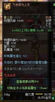 万世荣光上衣(90 级史诗轻甲上衣)90A 套 “万世荣光” 核心,力量 + 200,技能攻击力 + 18%,套装效果为全属强 + 60,是 90 版本升级超大陆的基础,所有轻甲职业的毕业选择;出处为魔界深渊。