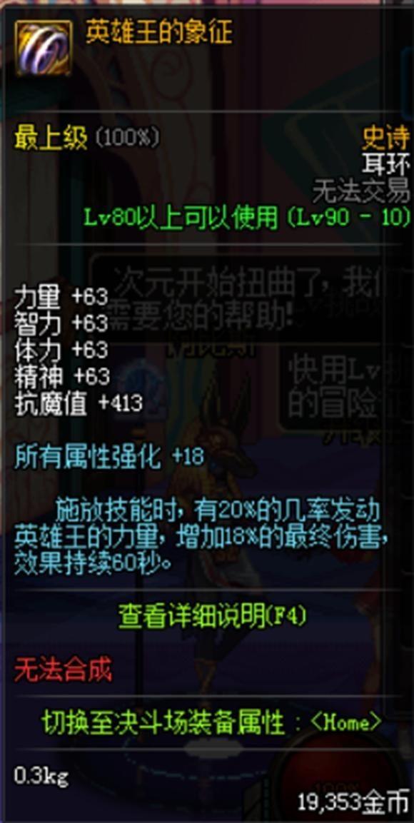 英雄王的象征(90 级史诗耳环,三神器之一)90 版本终极耳环,+18% 最终伤害,所有属性强化 + 18,外观华丽,是所有职业的毕业选择;出处为魔界深渊。