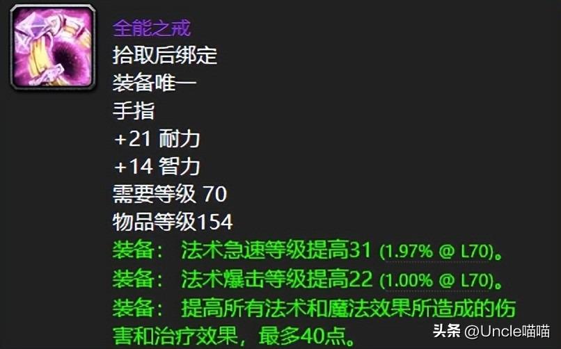 法系爆发向毕业戒指,+34 智力、+32 法术伤害,法术暴击与命中优秀;配合古尔丹之颅、薄片使用,爆发期伤害直接拉满,是太阳井阶段法系必争的极品